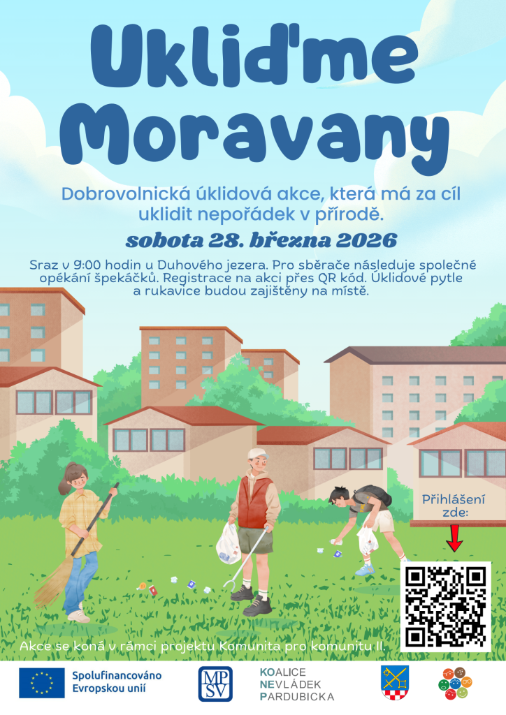 Dobrovolnická akce s názvem Ukliďme Moravany se uskuteční v sobotu 28. března 2026. Ta je součástí projektu Komunita pro komunitu II. „Cílem je zbavit obec i její okolí odpadků, které se během zimních měsíců nahromadily v přírodě, a vrátit tak místnímu prostředí jeho čistotu a krásu,“ upřesnila ředitelka Koalice nevládek Pardubicka (KONEP) Jana Machová. Ta je zároveň komunitní pracovnicí v projektu Komunita pro komunitu II.